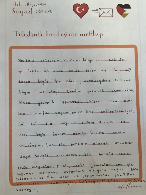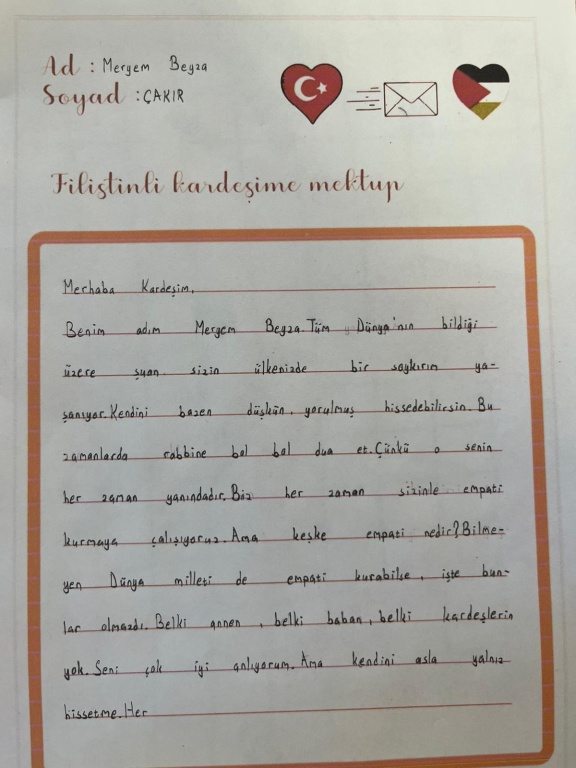 Bölgemizde ve küresel kamuoyunda büyük hassasiyetle takip edilen Filistin meselesi ile Küresel Sumud Filosu gündemi, eğitim camiamızın ortak vicdanını güçlü biçimde temsil etme sorumluluğunu kurumsal bir gereklilik olarak beraberinde getirmektedir. Bu yüksek kurumsal ve ahlâkî sorumluluk bilinci doğrultusunda okulumuzda farkındalık etkinlikleri düzenlenmiştir. Türkiye Yüzyılı Maarif Modeli'nin (TYMM) Erdem-Değer-Eylem yaklaşımı esas alınarak, öğrencilerimizin ulusal ve evrensel meseleler karşısında eleştirel düşünme becerisi ve sorumluluk bilinci geliştirmeleri hedeflenmiştir.